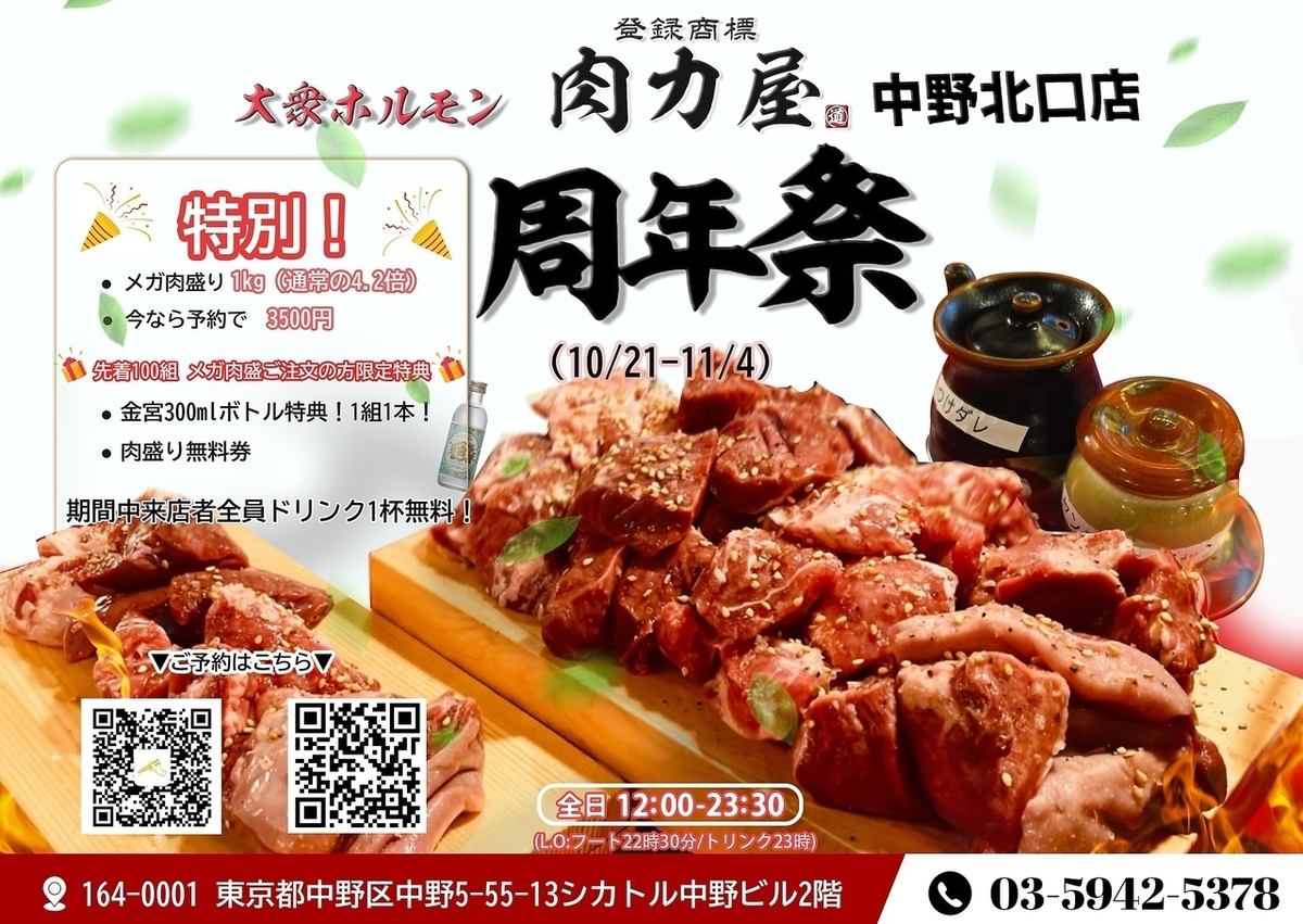 メガ肉盛り(1kg)通常の4.2倍の量を3500円(税込)でご提供!予約特典として、金宮ミニボトル300ml1本/次回利用肉盛り無料チケットを先着100組にプレゼント!期間来店者全員に漏れなくドリンク1杯プレゼント!